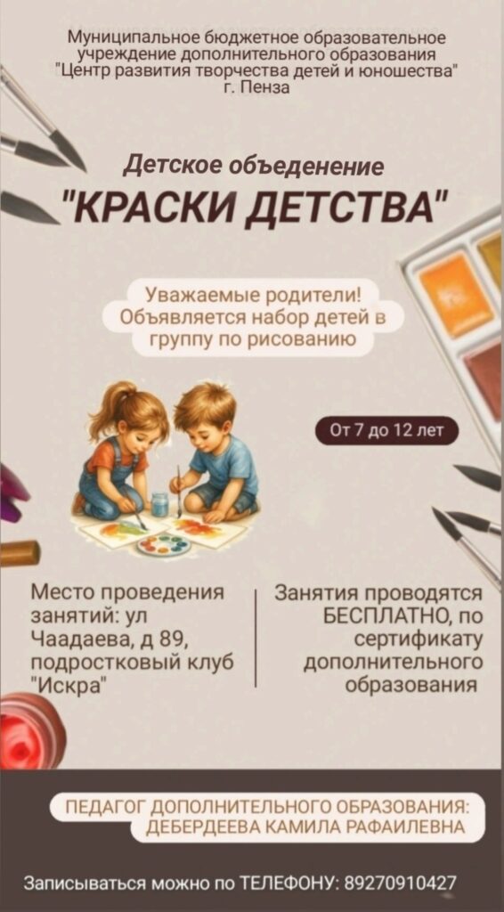 Главная2025Сентябрь22Объявляется набор детей от 7 до 12 лет в детское объединения «Краски детства» Объявляется набор детей от 7 до 12 лет в детское объединения «Краски детства»Набор на 2025-2026 учебный год / От cheche Объявляется набор детей от 7 до 12 лет в детское объединения «Краски детства»