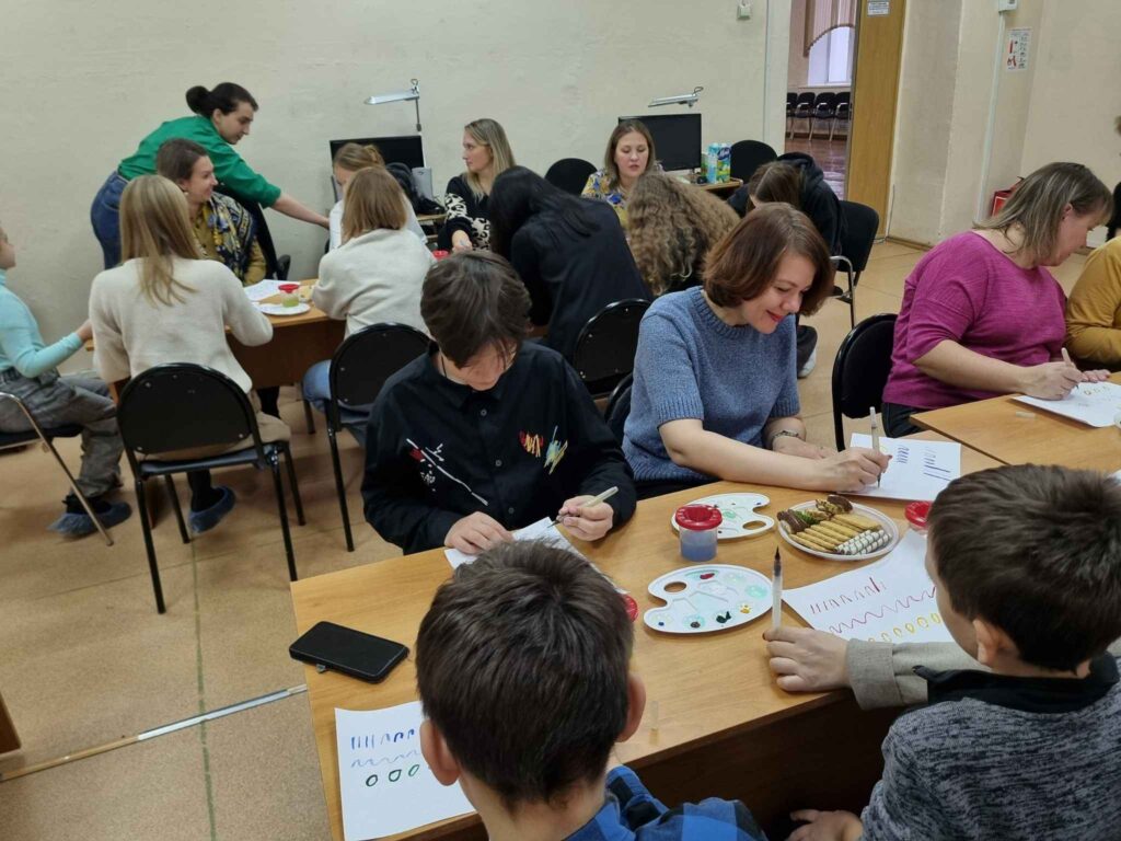 Мамы и детки готовили одну работу: дети выводили узоры и раскрашивали капибар, а мамы делали фон.