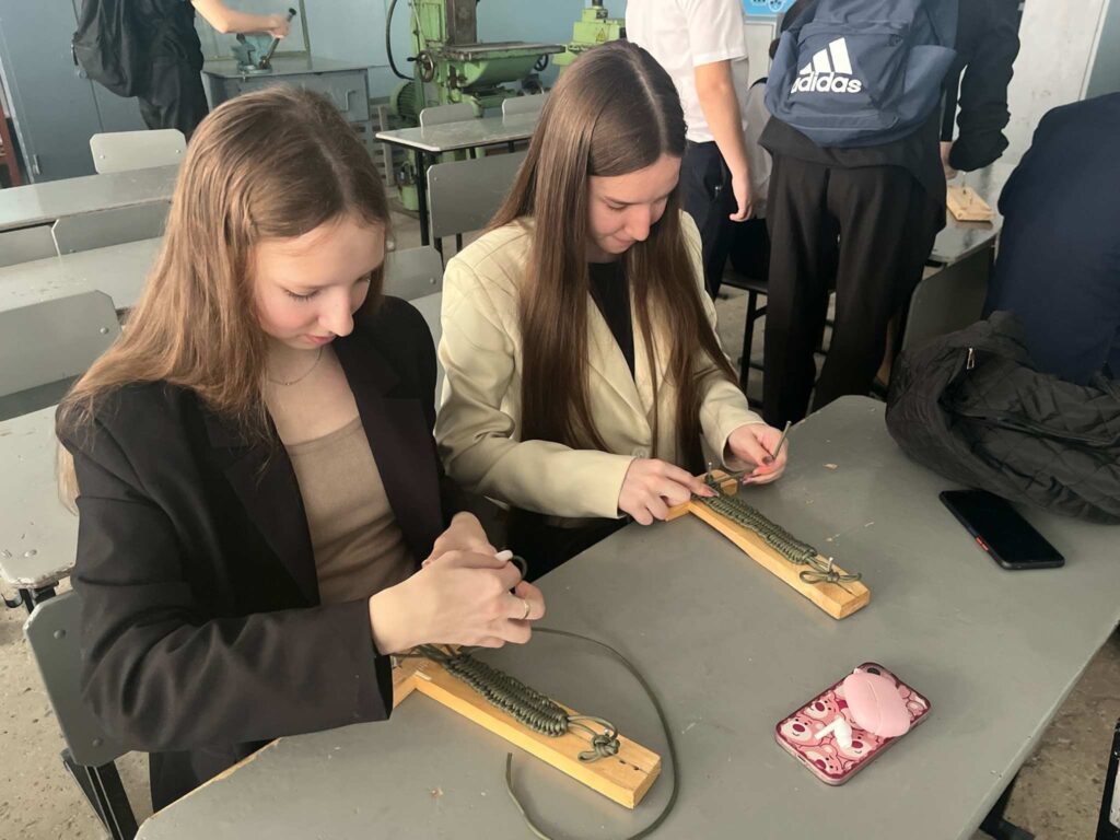 Ребята рассказали о том, что такое «паракорд», почему именно из него делают «браслеты выживания», и зачем они вообще нужны. Своеобразный тактический аксессуар в критической ситуации может спасти жизнь бойцу. Надежный трос очень удобно носить на руке в виде браслета. Специальная схема плетения «кобра» или «змейка» позволяет в любой момент быстро извлечь из паракордового браслета легкий и надежный трос. Он может понадобиться для закрепления грузов, экипировки, привязывания рюкзаков к полкам на технике. В экстремальных ситуациях прочная стропа может оказаться незаменимой – например, при спасении из воды. Длина браслета в распущенном виде составляет порядка 5 метров. В боевых условиях всегда найдется, где применить веревку. Но, если обычная может запутаться, то эта – удобно сложена в виде браслета. Участники самым простым способом сделали браслеты в хорошо известной схеме «Кобра».
